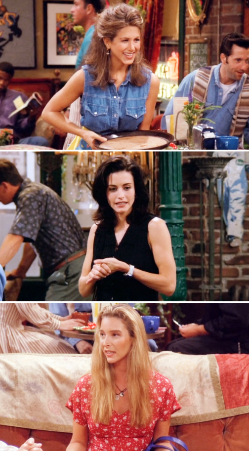 Rachel was typically dressed in greens and blues, Monica stuck to a palette of black, white, gray, and burgundy, while Phoebe adorned brighter colors and floral patterns. This careful curation helped to visually distinguish each character while maintaining a cohesive aesthetic for the group.