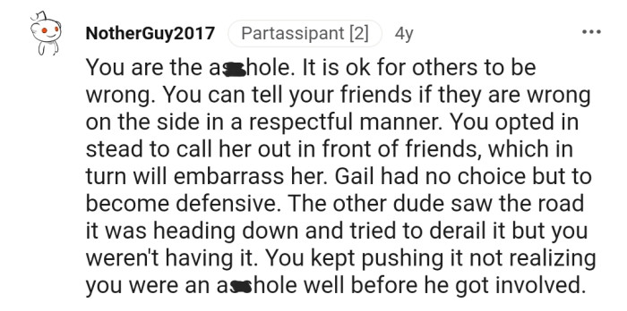 Someone within the friend group made a comment that pushed OP into a**hole mode