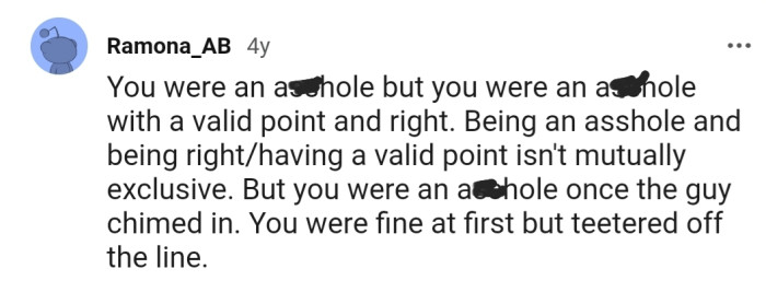 "You were an a**hole but you were an a**hole with a valid point and right"