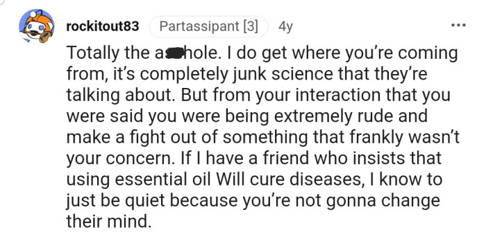 "Totally the asshole. I do get where you’re coming from; it’s completely junk science that they’re talking about"