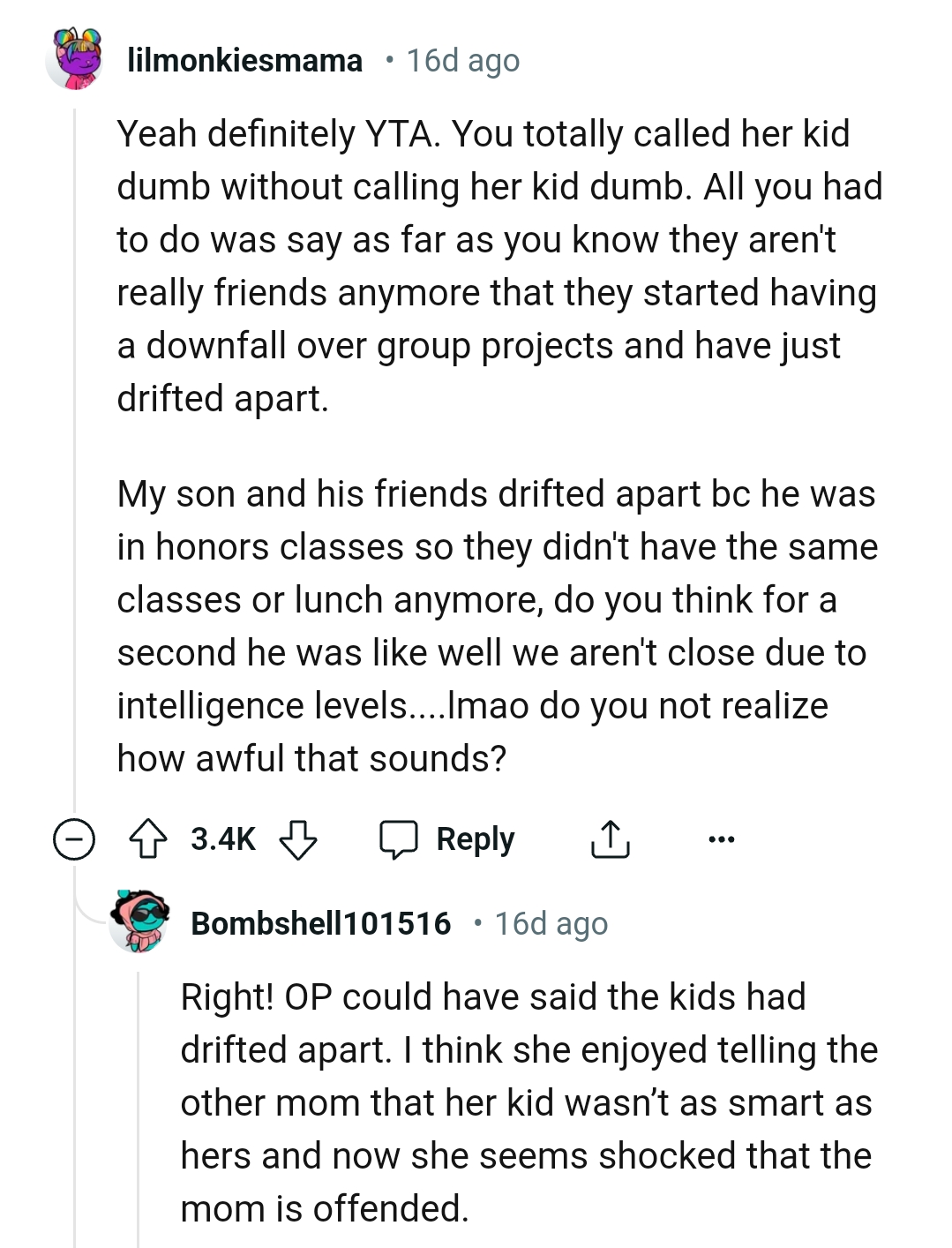 Causing a friendship to end seems drastic and implies that there were other factors contributing to their developing distance. Redditors faulted OP for telling another parent that her child is smarter than theirs, so she was declared the AH.