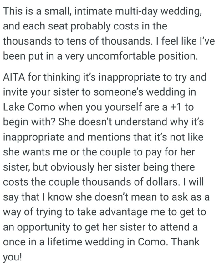 Reddit"It’s inappropriate to try and invite your sister to someone’s wedding in Lake Como"
