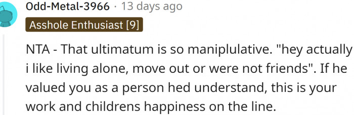 RedditOP is a single mom. She moved into a three-bedroom apartment with her kids. She manages apartments in the building, which earned her a rent discount. Her childhood male friend needed a place to stay, so he moved in with them.