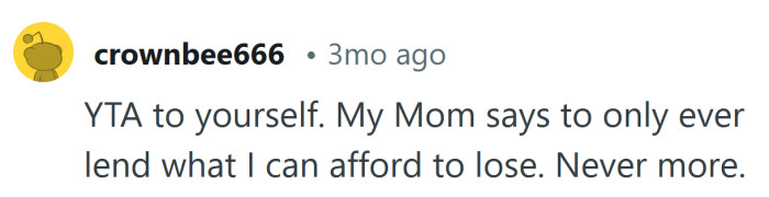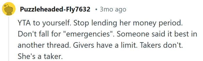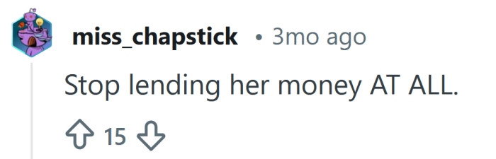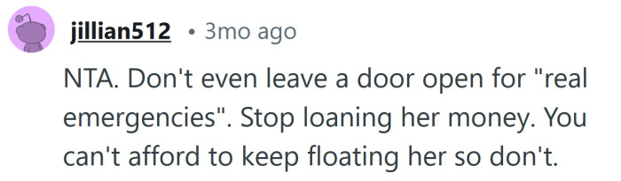 So the Redditor set a boundary, telling Ella they could only lend money for true emergencies from now on and that repayment deadlines needed to be respected. Ella immediately became upset, accusing the OP of being cold and untrusting.
