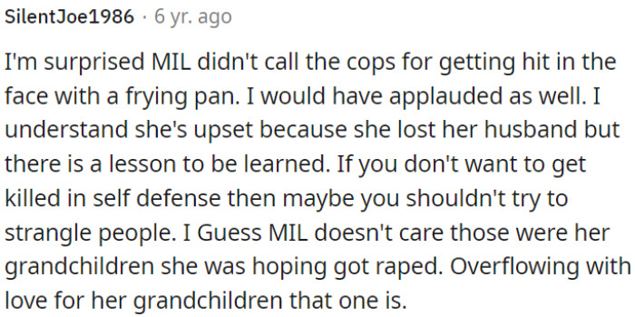 As the widow of the deceased launched into a vitriolic tirade against her son-in-law, calling him a murderer, he calmly walked up to the casket, got her attention, and placed a frying pan on it, saying, 'He can have this to remember me by in hell.'