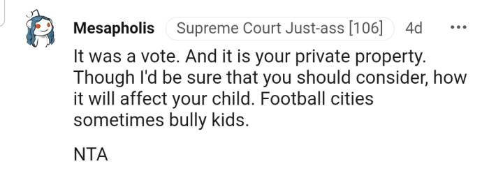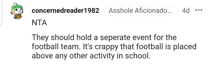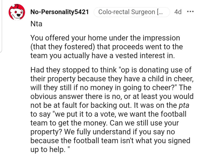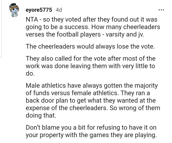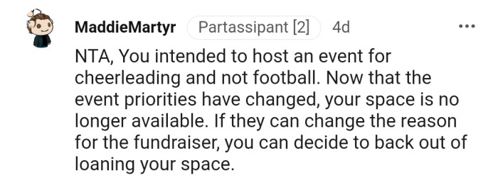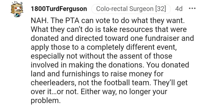 These associations are also an excellent opportunity for parents to positively change their children’s schools. During the planning phase of the event, OP offered to allow the association to use their property and furnishings for the event at no cost. Later on, however, the football coach mentioned that the team needed new equipment due to the worn-out state of the current ones. The association held a vote, and the decision was in favor of the football team, not the cheerleaders. This upset OP, as they felt the association always prioritized the football team over the cheerleaders. OP then withdrew their offer to provide property and furnishings for the event, leading to an uproar from other association members. They accused OP of wasting everyone’s efforts, leading OP to ask the AITA question. Check out the verdict below!
