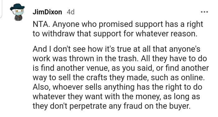 Reddit.comConsequently, OP decided to withdraw their gesture. This upset a lot of people, especially since they had put in a lot of work in preparation for the program. In addition, finding a new venue would be difficult so late