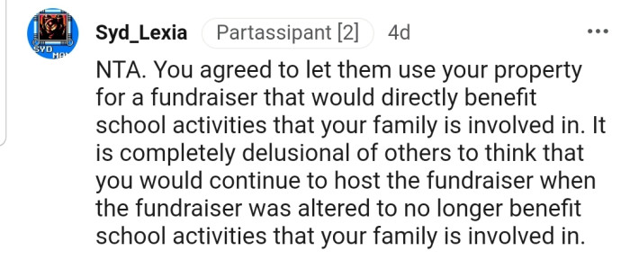 "It is completely delusional of others to think that you would continue to host the fundraiser when the fundraiser was altered to no longer benefit school activities that your family is involved in."