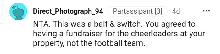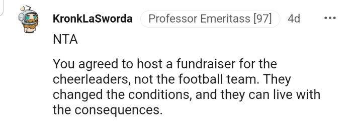 Reddit.com"You agreed to having a fundraiser for the cheerleaders at your property, not the football team."