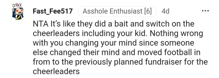 The post went viral, garnering over 19k upvotes and 2.4k comments. We gathered the best reactions from the Reddit community below: Dr. Michael Thompson, an ethics scholar at the University of Chicago, explains that ethical dilemmas often arise in fundraising contexts. When a parent feels misled by a fundraising organization, it can lead to feelings of betrayal and anger that may affect their perception of the school. Such situations highlight the importance of transparency and trust in community initiatives. Dr. Laura Simmons, a social psychologist at Duke University, examines the emotional dynamics involved in fundraising efforts. Her research indicates that individuals often feel a deep emotional connection to the causes they support, leading to heightened expectations regarding how funds will be used. In this case, the parent's reaction reflects a common response when those expectations are not met, leading to feelings of betrayal and frustration. Dr. Brené Brown, a researcher on vulnerability and trust, emphasizes that trust is built on clarity and transparency. In this case, the parent’s reaction to the fundraiser's change in direction may stem from a perceived breach of trust. Research in social psychology indicates that when expectations are not met, it can lead to feelings of betrayal and resentment. Behavioral research indicates that trust is a crucial element in fostering community engagement and participation in fundraising. When trust is broken, as seen in this case, it can lead to a withdrawal of support and a negative impact on communal efforts. Understanding the psychological implications of these feelings can help organizations address concerns proactively. Studies published in the Journal of Community Psychology show that when individuals feel misled about the use of their contributions, it can lead to decreased trust and willingness to support future initiatives. This situation illustrates how emotional investments can complicate relationships with organizations and other stakeholders. Understanding these dynamics can help individuals navigate their feelings and foster healthier relationships with fundraising entities. According to studies published in the Journal of Social Issues, changes in fundraising approaches can often leave donors feeling manipulated if not communicated properly. Understanding these psychological dynamics can help organizations manage expectations and maintain donor trust. Effective communication strategies are vital in ensuring that all stakeholders feel valued and respected. Studies show that transparent communication practices can enhance trust and encourage participation in community activities. When organizations provide clear information about how funds will be used, they foster a sense of ownership among participants. This engagement can lead to more successful fundraising efforts and stronger community ties. Effective communication strategies for fundraising organizations involve transparency and regular updates regarding how funds are allocated. Research suggests that maintaining open lines of communication can help build trust and prevent conflicts. Organizations should strive to honor the commitments made during fundraising efforts, ensuring that contributors feel valued and heard. Dr. Robert Cialdini’s principles of persuasion highlight that clear communication is key to successful fundraising. When donors feel misled, they are less likely to contribute in the future, which can be detrimental to ongoing fundraising efforts. In this case, the parent’s withdrawal of support reflects a broader concern about transparency and ethical practices in fundraising. To rebuild trust, organizations should consider holding open forums or discussions to clarify their objectives and address any concerns from community members. This practice not only promotes transparency but also invites collaborative problem-solving, which can enhance community cohesion. Additionally, regularly updating supporters about fundraising progress can help maintain trust over time. Practical solutions for this situation include advocating for clear communication from the fundraising organization regarding how contributions will be used. Establishing community oversight or feedback mechanisms can also enhance trust and accountability. Encouraging dialogue between contributors and organizations can foster understanding and collaboration, ultimately leading to more successful fundraising efforts. To prevent misunderstandings in future fundraising efforts, organizations should prioritize transparency and open communication with potential donors. Establishing clear goals and expectations at the outset can help foster trust and ensure continued support. Additionally, soliciting feedback from donors can enhance relationships and improve future campaigns. Dr. Stephen Covey, a thought leader on trust and leadership, emphasizes that trust is the foundation of effective community engagement. In this scenario, the parent’s reaction serves as a reminder of the need for organizations to cultivate trust through consistent and honest communication. Research shows that organizations that prioritize trust-building are more successful at maintaining donor relationships. The Reddit community has unanimously absolved OP of any blame in this case. To them, OP had only offered the property when the fundraiser was for the cheerleaders. So by switching focus to the football team, OP was well within their rights to withdraw their donation. What's your take on this story? Join the conversation in the comments below! This situation illustrates the delicate balance between donor expectations and organizational transparency. It's essential for organizations to communicate openly about changes in fundraising practices to maintain trust and support from their community. Analysis generated by AI Trust and communication are critical components of successful fundraising and community engagement. Re