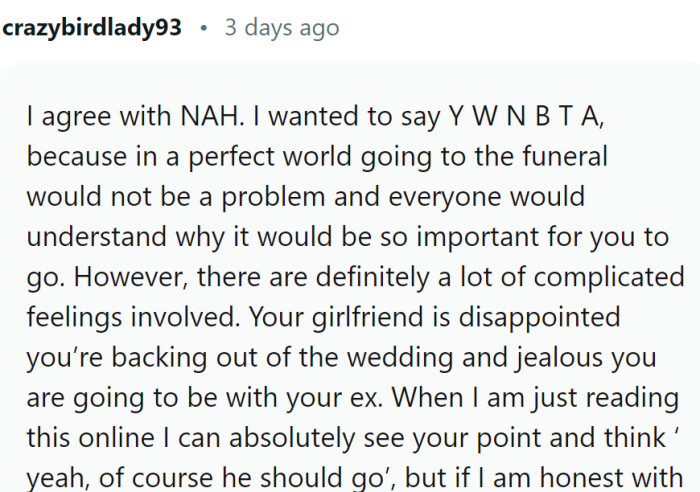 The story of OP's struggle with his past and present relationships highlights the complexity of human emotions and the challenges we face when trying to navigate the fine line between loyalty and love. OP's decision to attend Dan's funeral despite his commitment to Amelia's sister's wedding was driven by his deep bond with Dan and his desire to honor their friendship.