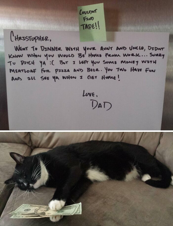 "Just Got Home From Work And Found This Note From My Dad On The Fridge. A Little Confused, I Walked Into The Living Room To Find My Cat, As Promised"