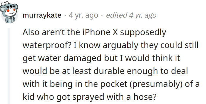 One parent even threatened to sue the OP because water damaged her son's iPhone 10. The OP told her it was her problem since she had allowed such an expensive device for an eight-year-old.