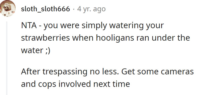 However, during the following encounter, the OP opted for a different approach, using the garden hose to spray the intruders and drive them away rather than involving law enforcement. This action provoked a visit from a group of furious parents, and none of them seemed willing to apologize for the misdeeds of their offspring.