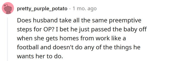However, during a recent argument, the Redditor's husband accused her of "sabotaging his time" and leaving him with an inconsolable baby. The OP says she is genuinely trying to set her husband up for success, but he doesn't believe her.