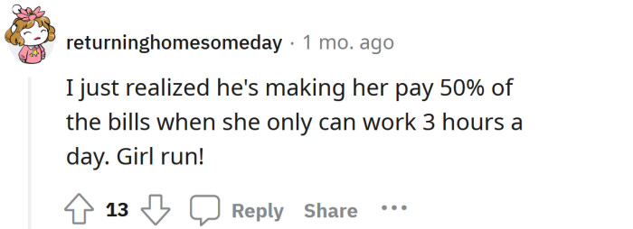 When the OP mentioned quitting her job, her husband said that if she did, he would still expect her to pay her share of the bills. Now she's caught between a rock and a hard place and isn't sure what to do.