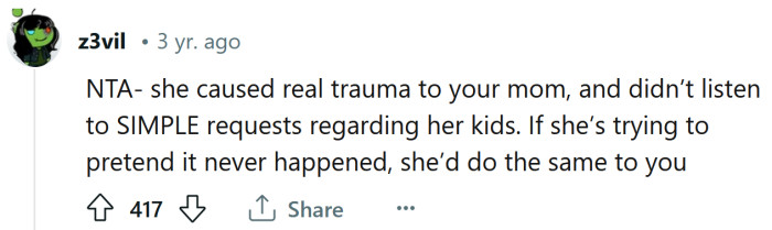 Of course, OP's grandma denied everything and told the Redditor to stop "living in the past." Now the OP is wondering if she's the a**hole here.