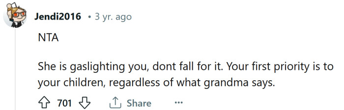 This situation highlights the serious implications of gaslighting within familial relationships. It’s essential for individuals to prioritize their emotional safety and establish boundaries to protect themselves and their children from manipulative behaviors.