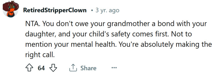 For the Redditor, establishing clear limits on interactions with her grandmother can serve as a protective measure to ensure the well-being of her child and herself.