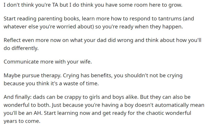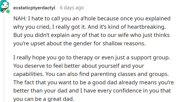 Redditors told the OP that by recognizing his father's mistakes, he is already halfway to being a better father to his child. The gender of a child doesn't determine what kind of father the OP will be; he does.