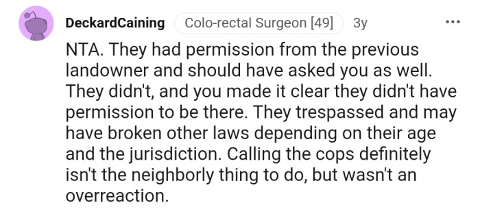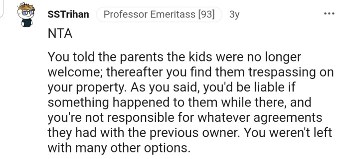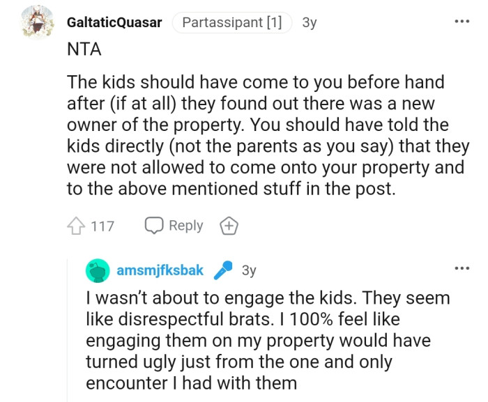 "The kids should have come to you beforehand after they found out there was a new owner of the property."