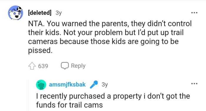 What initially appeared to be innocent escapades turned into something far more alarming. These kids not only invaded OP's property without permission but also indulged in risky behaviors such as drinking, smoking weed, and shooting at squirrels and birds with pellet rifles.