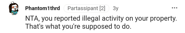 Some commenters have reiterated OP's concern that they could have been sued for allowing illegal activity on their property. As much as calling the police is not neighborly behavior (as one Redditor said), their neighbors didn't leave them with any other option.