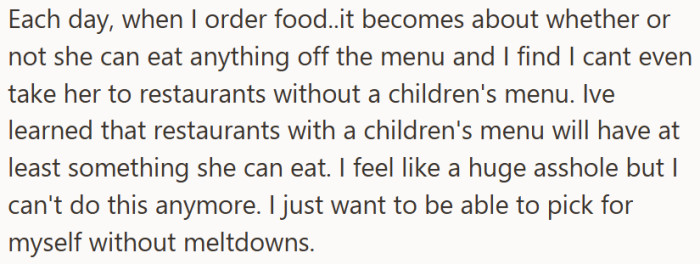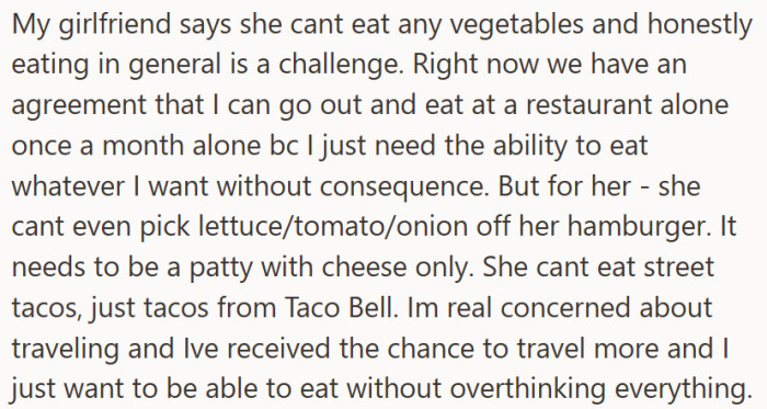 They were supposed to share a normal meal together, but it turned into a daily negotiation where he wanted to try different cuisines and she treated every restaurant like a minefield. The bigger issue was not the food itself, it was the control, the anxiety, and the way their dining habits started to feel like rules she could not bend and pressure he could not swallow.