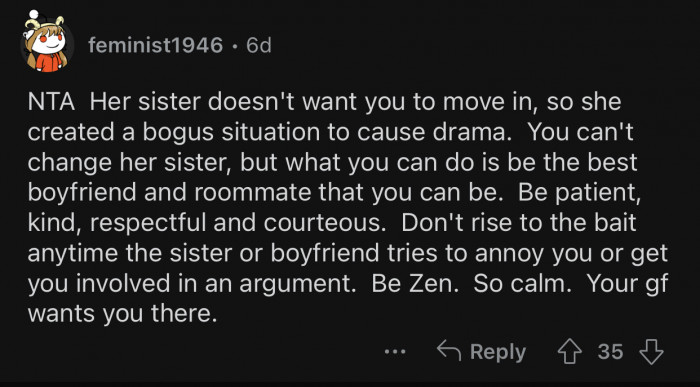 "Don't rise to the bait anytime the sister or boyfriend tries to annoy you..."