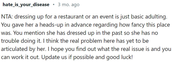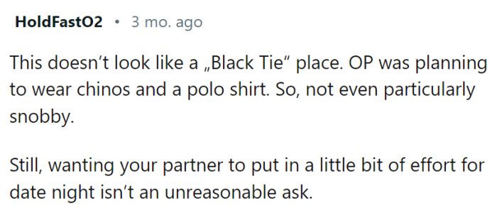 OP's girlfriend dismissed his concerns, leading to tension that eventually resulted in the cancellation of their evening out. This incident left OP perplexed, especially since his girlfriend usually enjoyed dressing up for even casual outings.