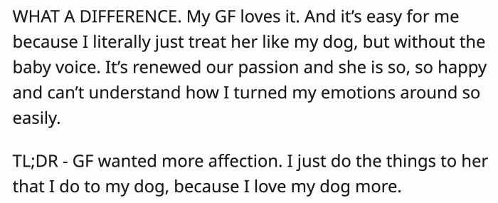 He's also been rubbing her shoulders, playing with her hair, or putting his hand on her thigh in the same vein that his dog enjoys pets and scratches. He has also started to be more 'kissy' and playful around her. A consenting relationship between two adults is most definitely between the two of them. We can offer our two cents here and there, but at the end of the day, it's their relationship. What do you think of OP's methods? On one hand, it's great that OP found a way to express his feelings in a way that's comfortable for him, but on the other hand, how would you feel if you were his partner, knowing he was treating you the same way he treated his dog?She's wondering how OP managed to quickly adjust his affections, but he admits it's easy for him because he is just treating her like his dog