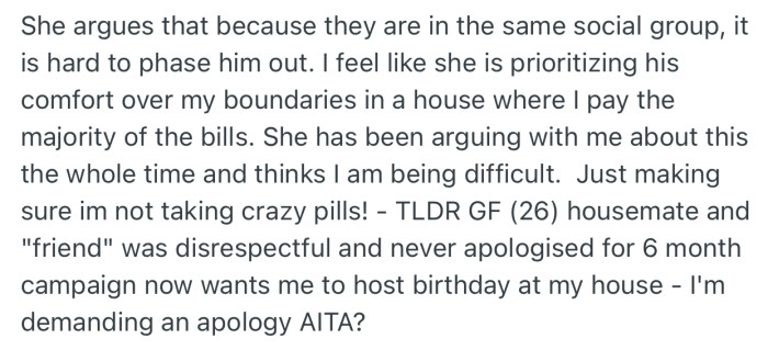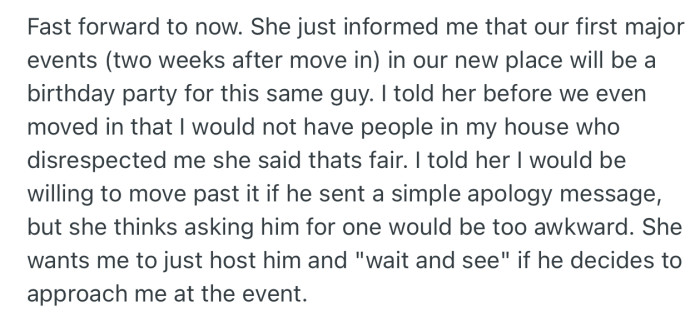 For him, the issue is respect and whether past behavior should be addressed before moving forward. For her, it seems to be about maintaining friendships and avoiding tension within a shared social circle.