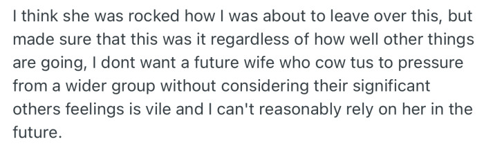 Meanwhile, the woman’s side keeps circling back to the social circle issue, like she’s trying to avoid tension at every gathering her friends will attend.