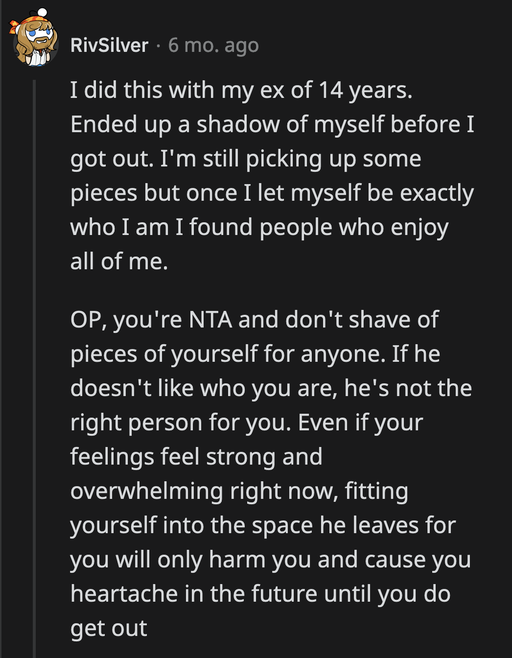 "Fitting yourself into the space he leaves for you will only harm you." Couldn't have said it better.