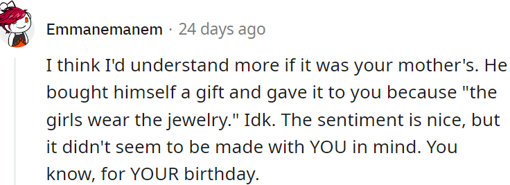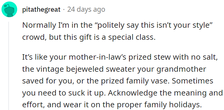 In the grand scheme of sentimental treasures, sometimes you gotta take one for the team—and Redditors rang this loud. Some gifts carry a weight beyond their aesthetic appeal, and this was one of them.