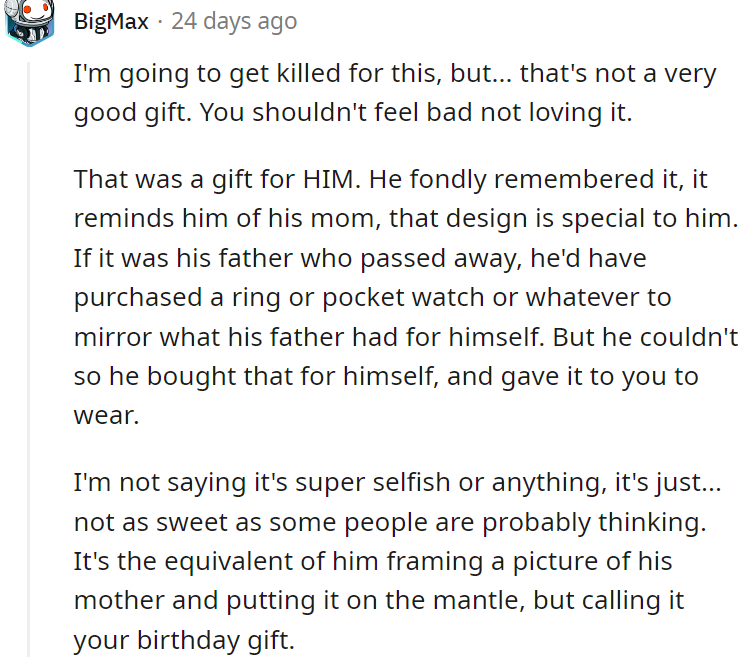 OP was accustomed to her partner's impeccable presents, so when her birthday rolled around, expectations soared as usual. He began with a heartwarming backstory of his mother’s tragic death and the charming pendant she was buried with.