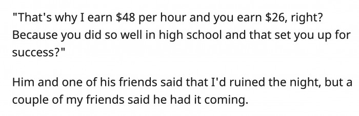 She snapped back and replied to her boyfriend, "That's why I earn $48 per hour and you earn $26, right? Because you did so well in high school, and that set you up for success?"