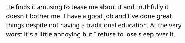 OP's boyfriend enjoys teasing her about her lack of a high school diploma. It doesn't bother OP as much, she said, because she has accomplished great things despite not having a traditional academic path.
