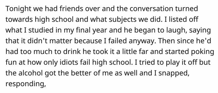 He had too much to drink and took the joke further by saying that only idiots fail high school. OP tried to brush it off, but she was also a little drunk.