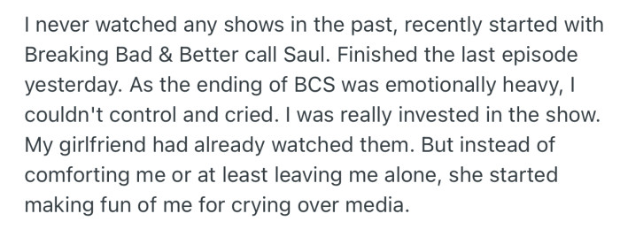 Young Woman Mocks Boyfriend For Crying During Emotional Show Ending, And Now He’s Questioning The Relationship