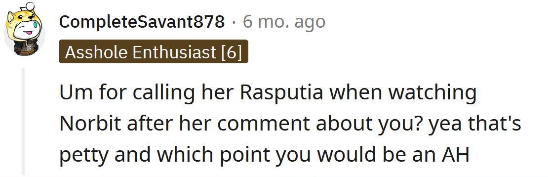 The OP is considering suggesting that they watch Norbit and telling her she reminds him of Rasputia to get revenge. Now he's asking the Reddit community if he would be an a**hole if he did.