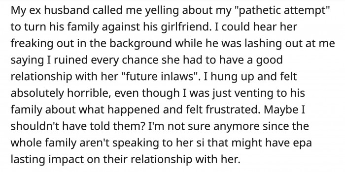 Finally, the ex-husband reacted and called OP to yell at her. OP heard the girlfriend freaking out during the call while her ex-husband was busy blaming OP for the drama and accusing her of ruining the girlfriend's chances with her future in-laws.