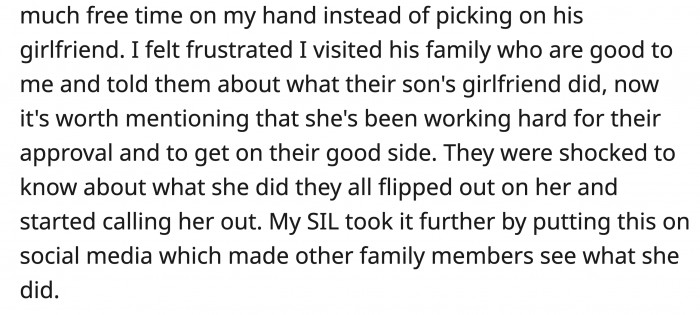 They were shocked and did not approve of what the new girlfriend did to OP's son. OP's former sister-in-law posted about it on social media, and now everyone in the family knows what happened.