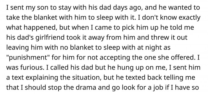 When OP came to pick him up, the three-year-old said his dad's girlfriend took the blanket from him and then threw it away. He slept without a blanket that night because his father's girlfriend was punishing him for not accepting the one she offered.