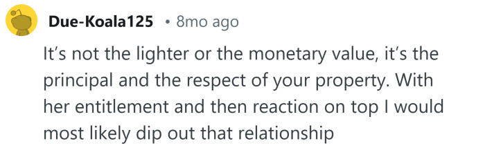 Days later, the situation escalated when she casually mentioned that she had given one of those lighters to a stranger. The girlfriend reportedly told the OP that it was “hers” and that she could do whatever she wanted with it, adding that he “didn’t have any use for it anyway.”