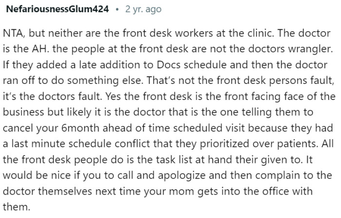 RedditDespite scheduling an essential appointment six months in advance, OP's mother found it abruptly canceled just days before