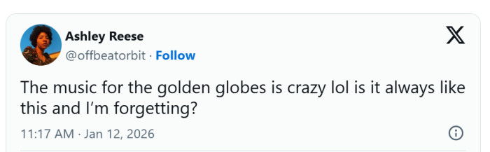 "The music for the Golden Globes is crazy lol is it always like this and I’m forgetting?"