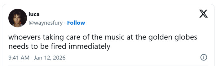 "Whoevers taking care of the music at the Golden Globes needs to be fired immediately,"