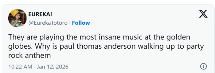 "They are playing the most insane music at the Golden Globes. Why is Paul Thomas Anderson walking up to Party Rock Anthem,"