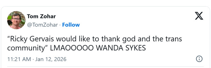 Before announcing the winner, Sykes took a moment to acknowledge Ricky Gervais, thanking him for “not being here.” She quickly clarified, “No, I love you, Ricky,” before delivering the line that sent social media buzzing. “But because if you win, I get to accept the award on your behalf, and you’re going to thank God and the trans community.”